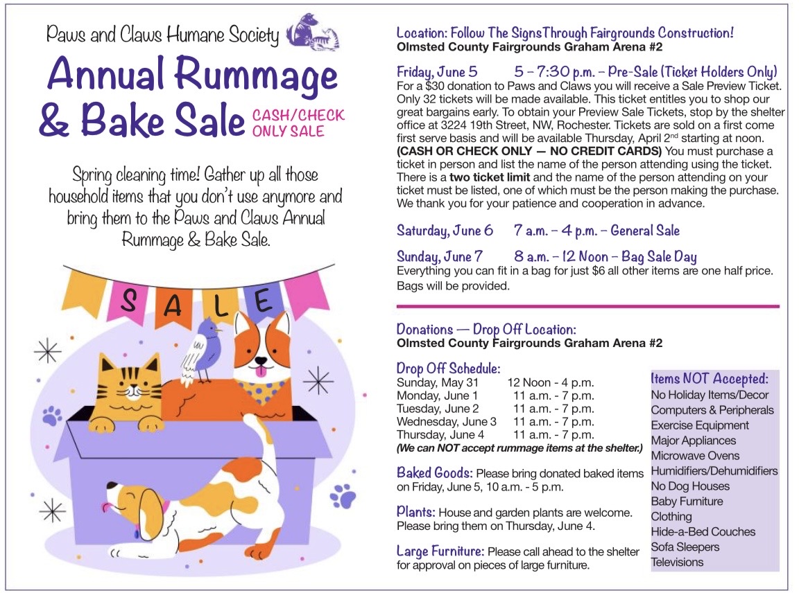 Save your stuff! We can’t hold or accept anything at our shelter as we are completely out of room. We will only accept donations at the fairgrounds during those times. More details to follow on what we can and can’t accept.